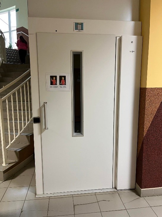 W budynku mieści się oznakowana winda dostosowana do transportu osób ze szczególnymi potrzebami. Jej przystosowanie polega na zapewnieniu odpowiedniej wielkości kabiny i drzwi oraz usytuowaniu elementów sterowych w sposób ułatwiający korzystanie z przycisków. Umożliwia ona dostęp z parteru budynku na piętro i z powrotem. Winda obsługiwana jest przez przeszkoloną osobę.